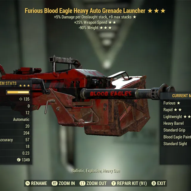 Type: Weapon. Furious, weapon speed, 90% reduced weight automatic grenade launcher. Max level