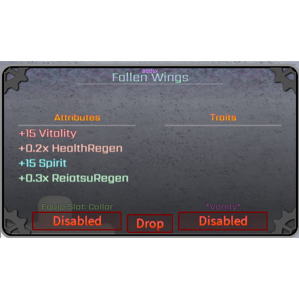 This item gives the player 15 Vitality, 15 Spirit and 30% Better Reiatsu Regen and 20% Better Health Regen