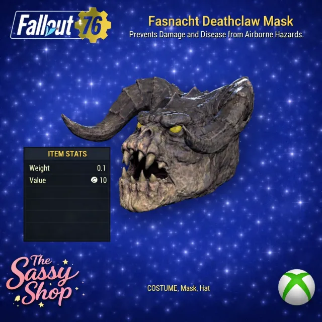 Fasnacht Deathclaw Mask - A massive papier-mâché mask resembling a deathclaw’s head with an open mouth. There is a red Atomic Shop variant. Type: Apparel