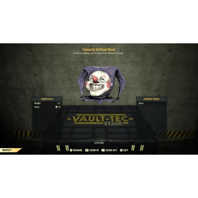 One (1) Fasnacht Buffoon Mask for Fallout 76 on Xbox.