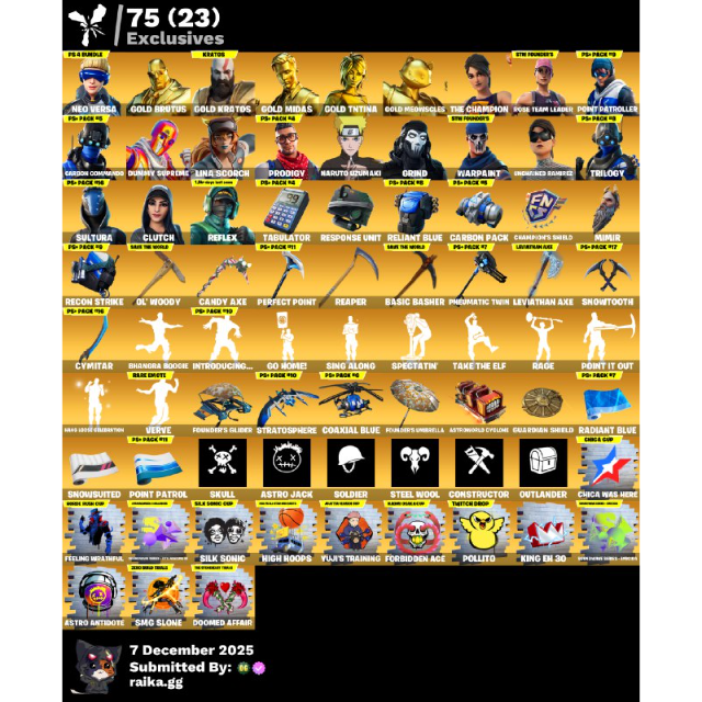 [WARNING: Stay safe! Deals made outside Gameflip aren’t protected. Always trade and chat within Gameflip.] [PC] 364 skins | OG STW | Renegade Raider | Neo Versa | Gold Midas | Gold Brutus | Gold TNTina | Gold Meowscles | Gold Kratos | Grind | 1650 VB