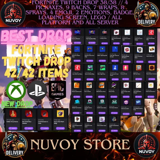 Game AccountFORTNITE TWITCH DROP 42/42 // 4 PICKAXES, 9 BACKS, 7 WRAPS, 8 SPRAYS, 4 EMOJI, 2 EMOTIONS, BADGE and more // All Platform