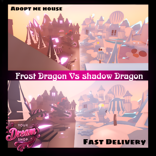Step into a world of fantasy with this dual-themed Adopt Me house, where the icy elegance of the Frost Dragon realm collides with the eerie darkness of the Shadow Dragon lair.