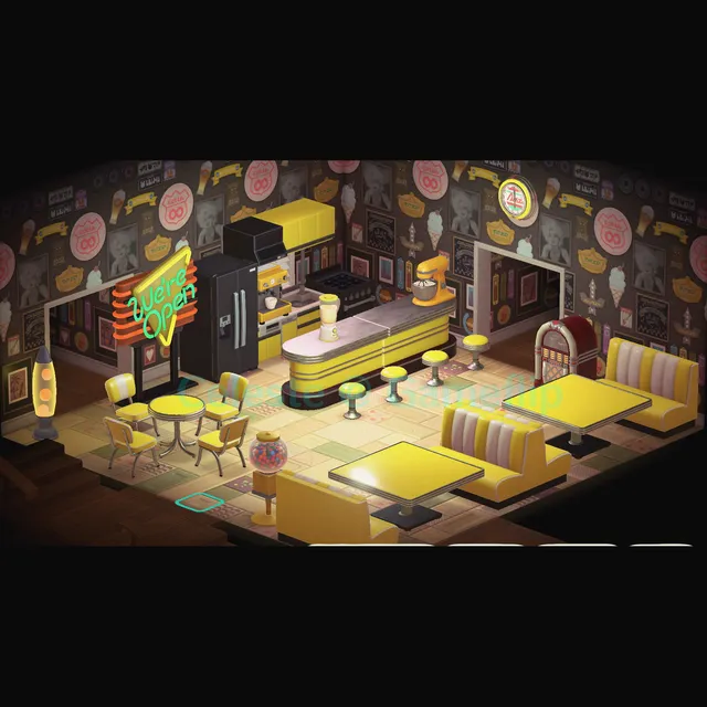 Full diner set plus extras for Animal Crossing New Horizons, including wallpaper and flooring. All other diner colours also available.