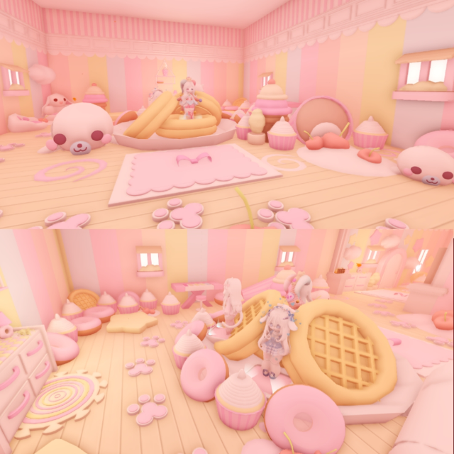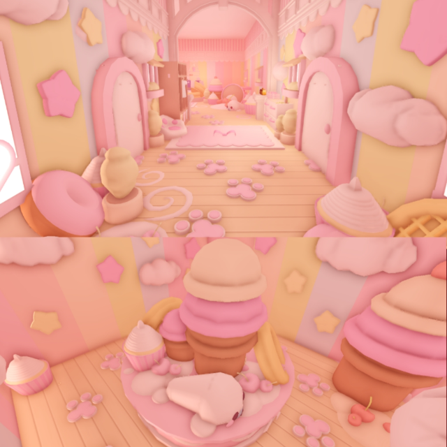 A dreamy pastel dessert paradise filled with harp-seal themed sweets, candy-soft furniture, and fluffy sugar-cloud décor. Every corner feels like a melting ice-cream fantasy blended with kawaii warmth.