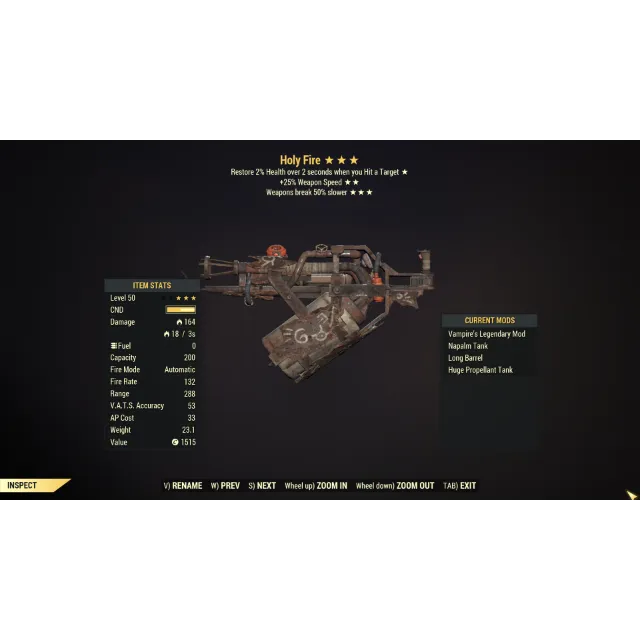 <p>The Holy Fire is a unique version of the flamer with a custom paint scheme, featuring cultist symbols. It drops with the following legendary effects: Vampire's: Restore 2% health over 2 seconds when you hit an enemy. Rapid: +25% faster attack speed. Durability: Breaks 50% slower. Cursed: +15% damage, +20% faster attack speed, -4 durability. Additional effect: 18 fire damage over 3 seconds (normal is 9/3sec). Like other named items from the Once in a Blue Moon update, the player can re-roll the main three effects while the unique effects will remain innate to the weapon.</p><p>Type: Weapon</p>