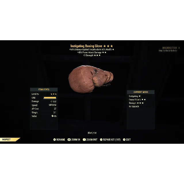 Instigating, 40% more power attack damage / heavy hitters, 3 strength boxing glove. Max level