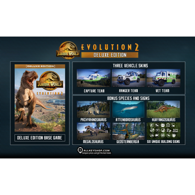Jurassic World Evolution 2: Deluxe Edition features five spectacular prehistoric animals, including all-new marine and flying reptiles, as well as six unique building signs, and three exciting vehicle skins inspired by the Dinosaur Protection Group to use across your Ranger Team, Capture Team, and Mobile Vet Unit teams in Challenge and Sandbox modes. Purchase the Deluxe Edition for the following species: Geosternbergia, Attenborosaurus, Pachyrhinosaurus, Huayangosaurus and Megalosaurus.