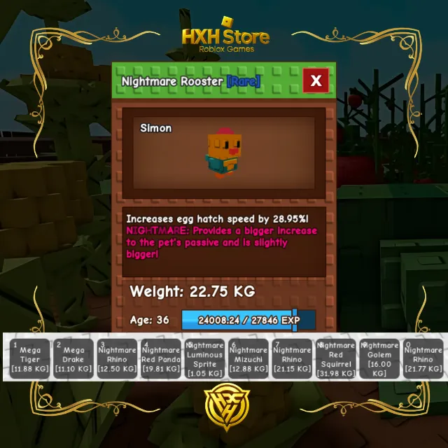 Tags: Huge Rainbow Mimic, Huge Rainbow Peacock, Huge Rainbow French Fry Ferret, Huge Rainbow Kitsune, Rainbow, Ascended, Barn Owl, Space Squirrel, Huge Rainbow Swan, Mega Swan, Max Level, 15 Seconds, Sheckles, Sugar Glider, Titanic, Huge, Colossal, Raccoon, Butterfly, Disco bee, Dragonfly, Queen Bee, Huge Rainbow Phoenix, Phoenix, Griffin, Cockatrice, Golden Goose, Swan, Rainbow Hatched, Red Panda, Mallard, Rainbow Red Panda, Red Panda GAG, Rainbow Red Panda, Mega Red Panda, Sheckles, Rainbow Hatched Dilophosaurus, Titanic Rainbow Peacock, Tiger, Tree Frog, Hummingbird, Iguana, Chimpanzee, Huge Tiger, Rainbow Tiger, Mega Tiger, Headless Horseman, Huge Headless Horseman, Spectral, Nightmare, Black Cat, Spider, Bone Dog, Bat, Pumpkin Rat, Wolf, Ghost Bear, Reaper, Huge Spider, Nightmare Mutation Service, Ghostly, Hex Serpent, Crow, Goblin, Goat, Dark Springgan, Penguin, Snowman, Soldier, Snowman Builder, Snow Bunny, Mistletoad, Krampus, Gift Rat, Arctic Fox, Frost Dragon, French Hen, Christmas Gorilla