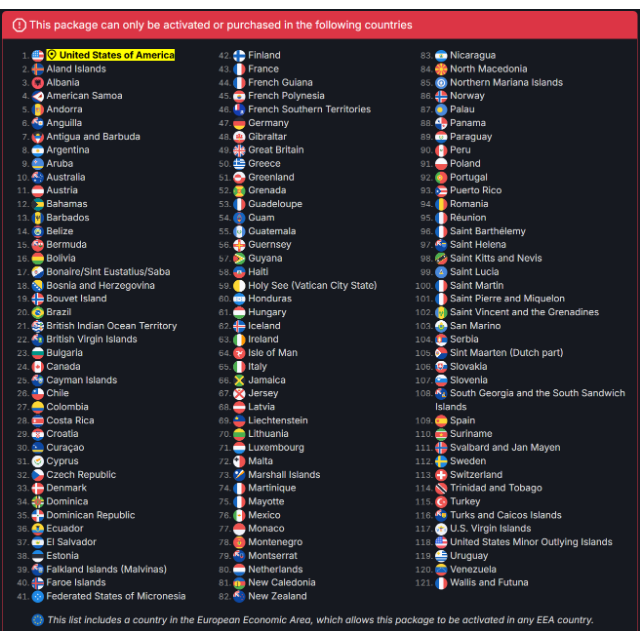 📢 📢 📢 This package can only be activated or purchased in the following countries: