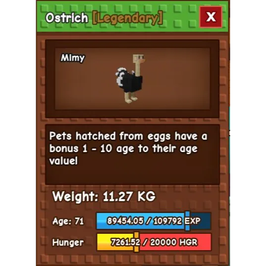 8 Ostriches over 11kg. Eggs hatch up to level 80.