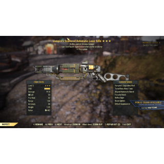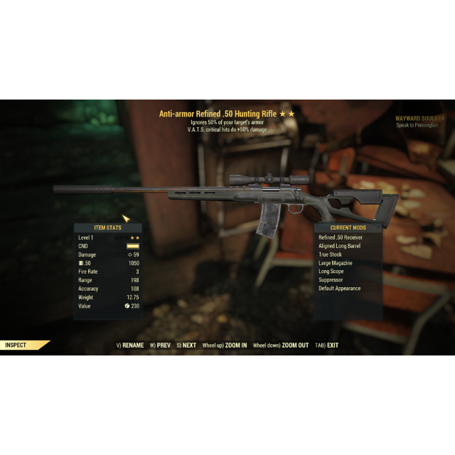 1. Hunting rifle anti armor/critical damage level 1 - very good weapon that you can use to level 5 then start using the legacy laser rifle