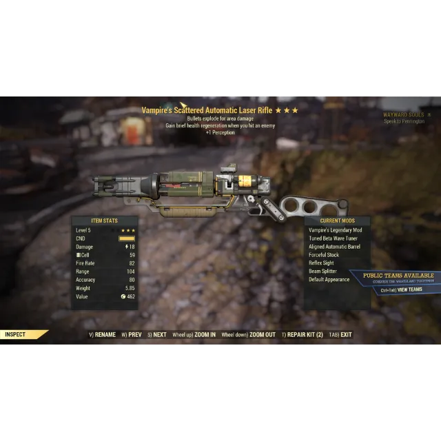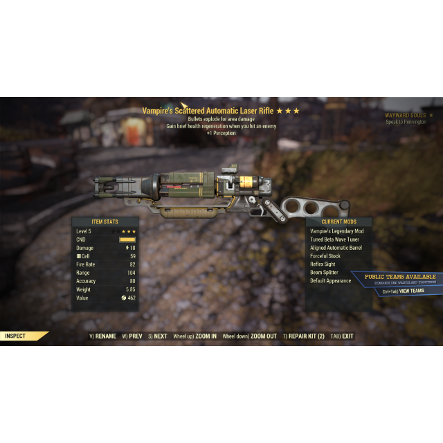 2. Vampire's/explosive/1 perception (v/e/1p) rare legacy laser rifle level 5 - really good damage and healing, can easily kill anything until you reach level 50 and it's still powerful enough!