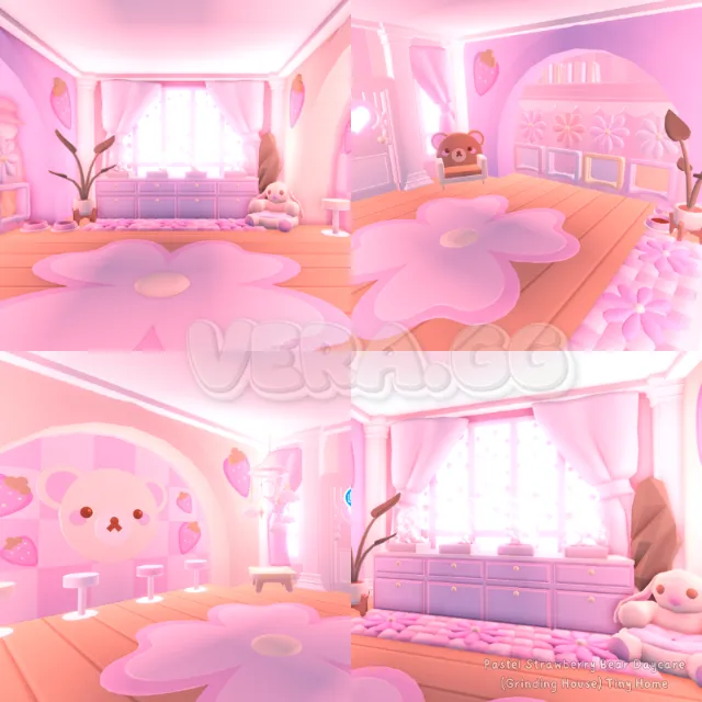 Level up your pets in style! This custom-built Pastel Strawberry Bear Daycare is a highly functional and adorable grinding house cleverly built inside the Adopt Me Tiny Home shell.