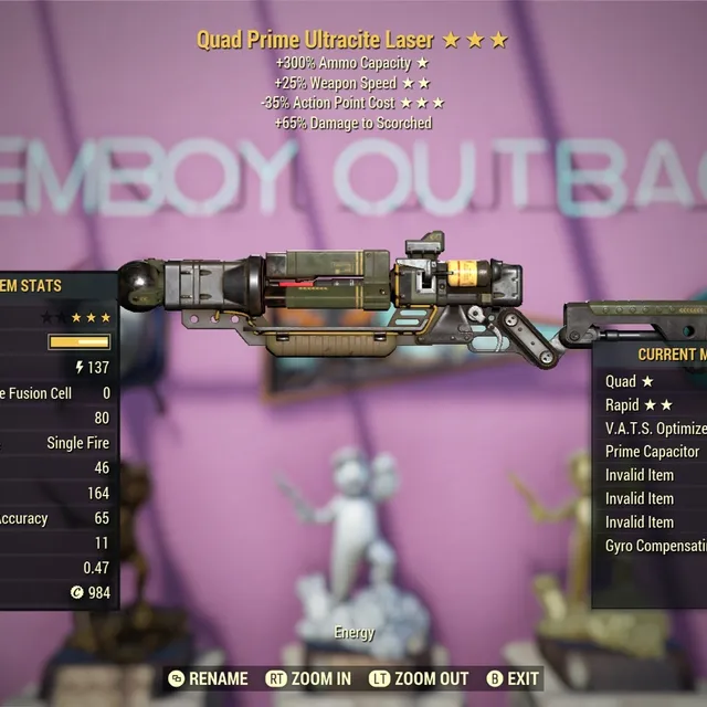 Quad 25 Faster Fire Rate Speed 35 Less Vats AP Cost Nuclear Winter Ultracite Laser Bat