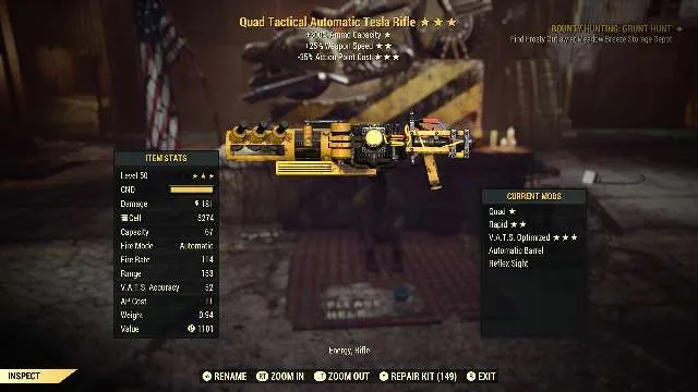 Type: Weapon . A absolute god roll. Quad 25% faster fire rate , 35%kess vats fully automatic Tesla rifle max rank reflex sight. Great for passing down to mules . Once you go quad, you'll never go back.
