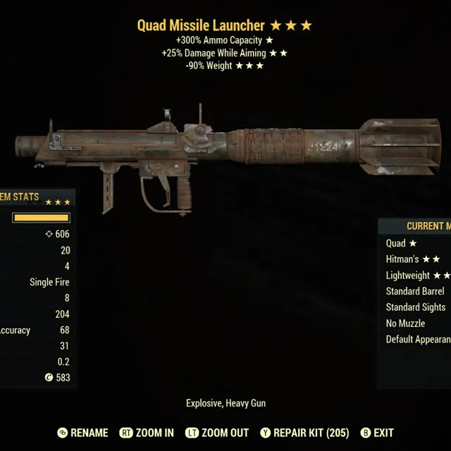 Type: Weapon. Quad, 25% more aim damage, 90% reduced weight missile launcher. Max lev