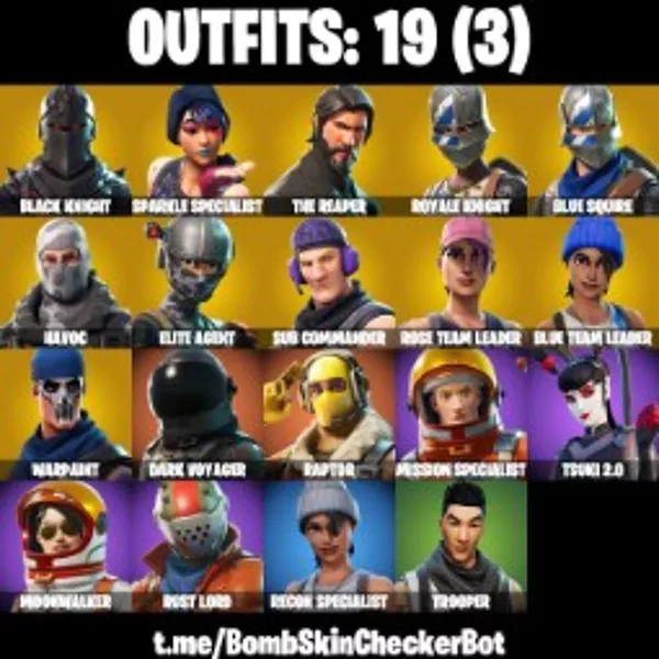Black Knight, Mako, AC/DC, Sparkle Specialist, Floss, Royale Knight, Blue Squire, The Reaper, OG STW, Elite Agent, Take The L, Havoc, Best Mates, Blue Team Leader, Rust Bucket, The Worm, Royale X, Snowflake, Sub Commander, Slipstream
