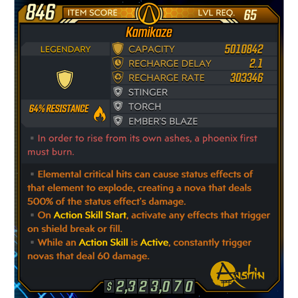 💥 Borderlands 3 Brand New LVL 65 Kamikaze Shield - Devil May Care style - Eradicate the Battlefield & destroy anything in your path. 5+ Million Capacity shield too! 💥