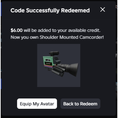 To activate the Roblox Exclusive Shoulder Mounted Camcorder and $6 Credit, follow these steps: