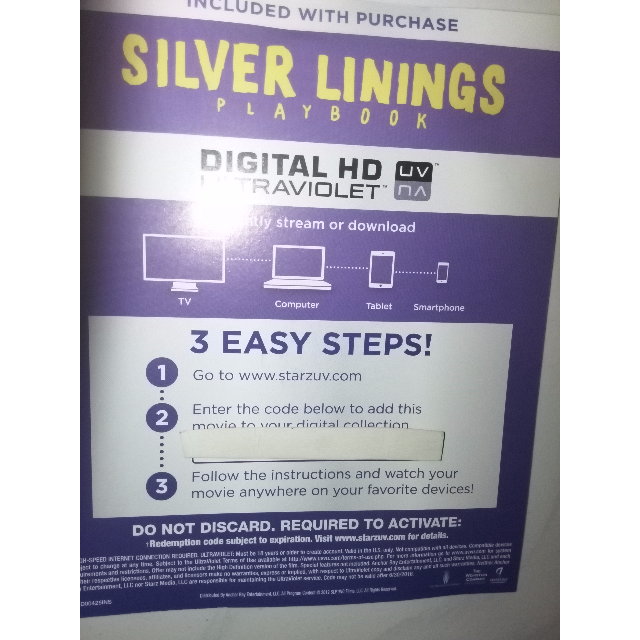 Digital UltraViolet UV Code (Works Only with VUDU) for Silver Linings Playbook. Its only valid on USA.