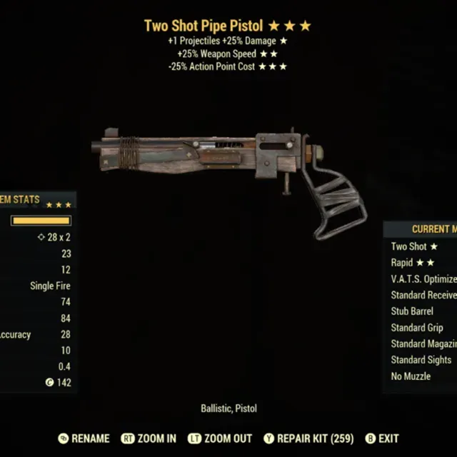 Type: Weapon. Two shot, fast fire rate / weapon speed, 35% less vats cost lvc automatic pipe gun / pistol / rifle. Max level