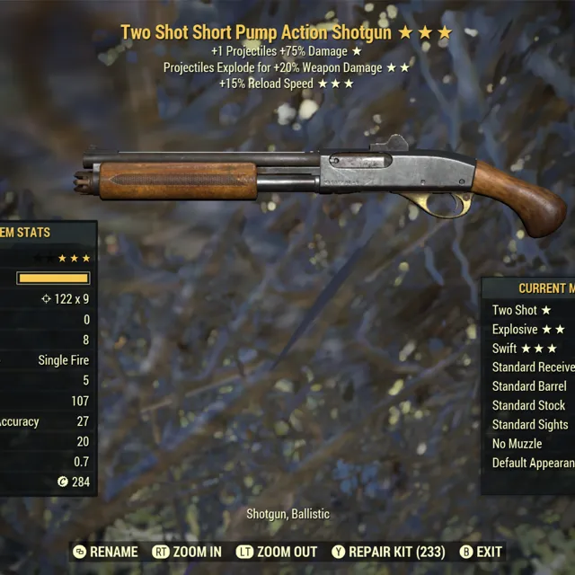 Type: Weapon. Two shot, explosive, swift pump action shotgun. Max level.