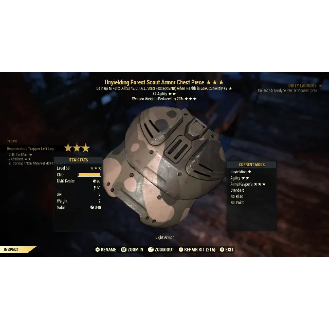 Unyielding, agility, arms keepers forest scout armor chest piece. Max level