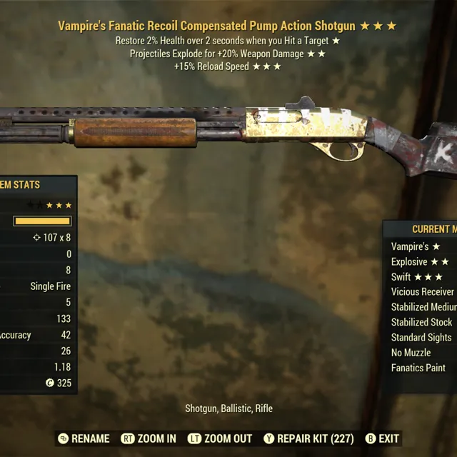 Type: Weapon. Vampires, explosive, fast reload pump action shotgun. Max level
