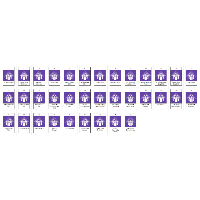 21. x21 Decorations: Fluffy, Message Display: Teshin, First/Last Five, kite;Vintage Case Container, Figurine, Community Glyph: Ordis Chatter, Statue: Ordis Manifest, Scene: Mainland Villages, Plant: Pikka, Shawzin: Nelumbo, Dax, Imitation, Korbu;Fireworks Grand Finale, Kuva's Drop, Ayatan Sculpture