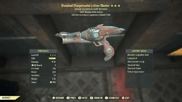 Bloodied, +25 damage while aiming, hits generate a stealth field.
