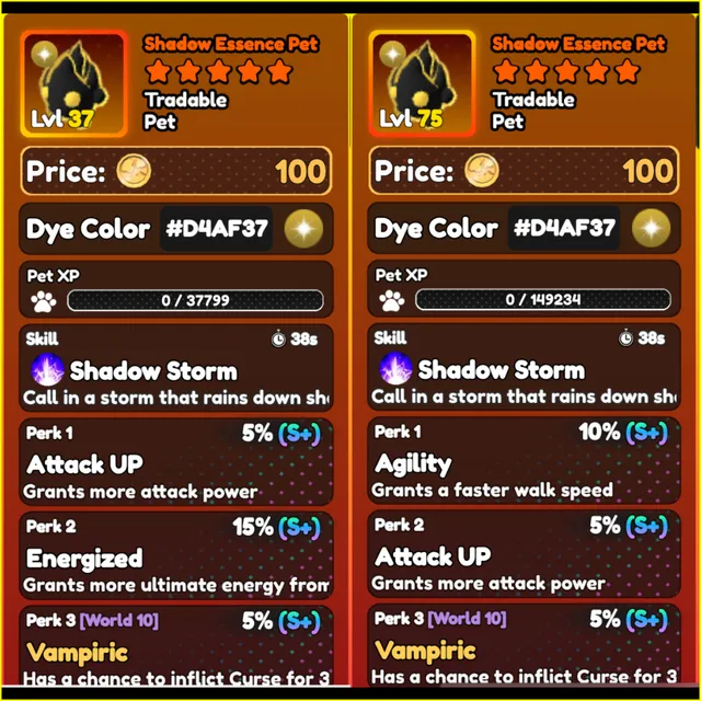 PERFECT GOLD HEX SHADOW ESSENCE = Perks are 5 vampiric, 5 Attack, 10 Agility