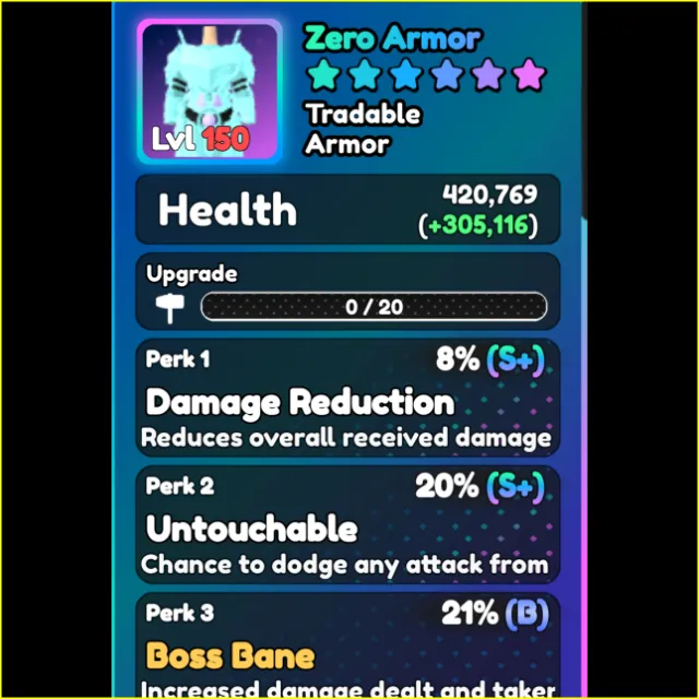 UNOBTAINABLE ZERO ARMOR BOB 21%, UNTOUCHABLE 20%, DAMAGE REDUCTION 8%