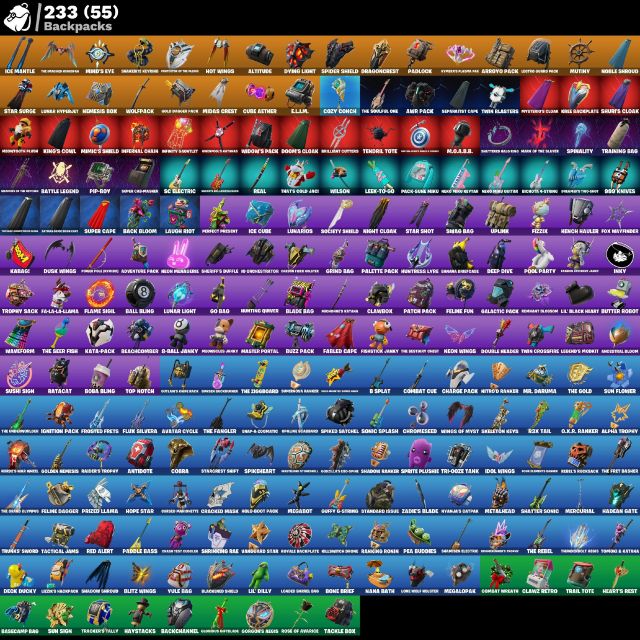 👕 180 Skins | 🎒 233 Back Blings | 🪓 205 Pickaxes | 💃 195 Emotes | 🪂 164 Gliders | 🎨 151 Wraps | ⭐ 10 Exclusives