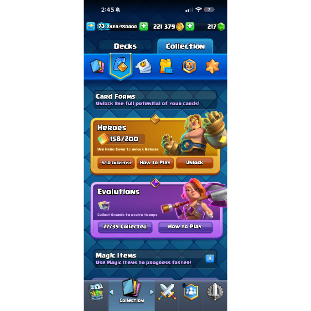 Enter the Arena! Clash Royale is a real-time multiplayer game starring the Royales, your favorite Clash characters and much, much more. Collect and upgrade dozens of cards featuring the Clash of Clans troops, spells and defenses you know and love, as well as the Royales: Princes, Knights, Baby Dragons and more. Knock the enemy King and Princesses from their towers to defeat your opponents and win Trophies, Crowns and glory in the Arena. Form a Clan to share cards and build your very own battle community.