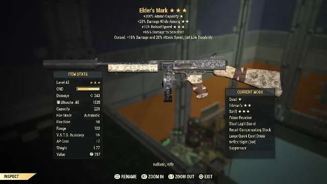 - Tradeable Legacy Roll Elder's Mark with Quad/Hitman's/Swift, fully modded (+300% Ammo Capacity, +25% Damage While Aiming, +15% Reload Speed)