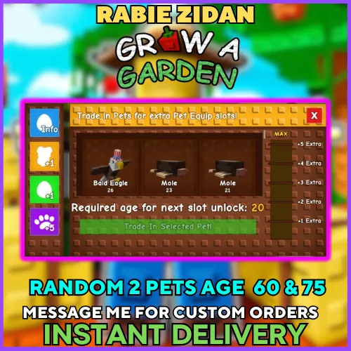 Random LEVEL 60 & 75 PETS | GROW A GARDEN ,TAGS ; GAG , GROW A GARDEN , for pet or egg slot free upgrade, x1 - 60, x1 - 75