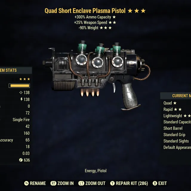 Type: Weapon. Quad, rapid, lightweight enclave pistol. Max level, basic attachments.