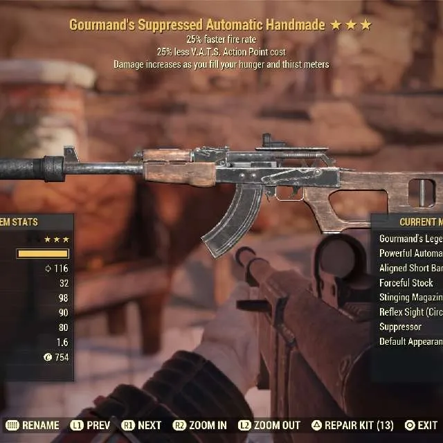 Gourmands faster fire rate 25 less vats cost Handmade Max Level