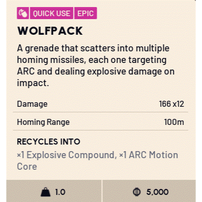 The Wolfpack grenade in Arc Raiders is an Epic quick-use explosive that scatters into homing missiles.