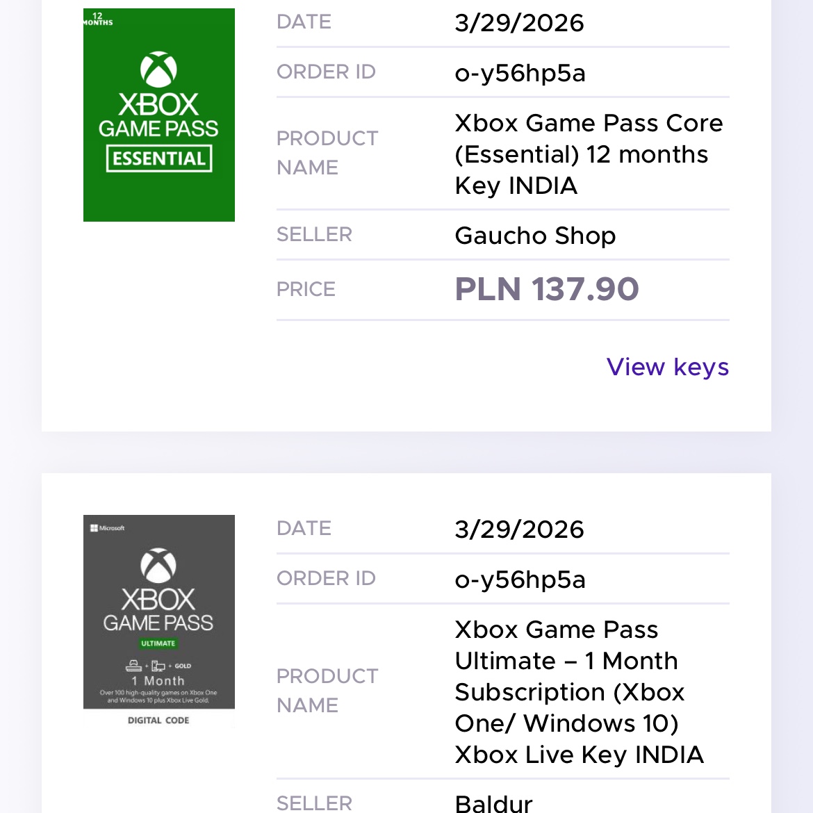Hello, i have 2 codes of game pass for INDIA region to sell, i bought it mistake and i need to resell it. The codes are not working at my country region.