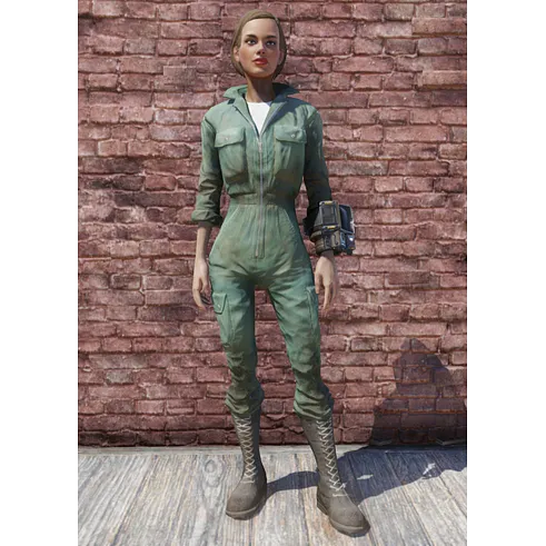 The mechanic jumpsuit is solid olive green, with a white crew-neck undershirt and black boots. Various versions of the jumpsuit include logos of different areas, factions, or pre-War companies.