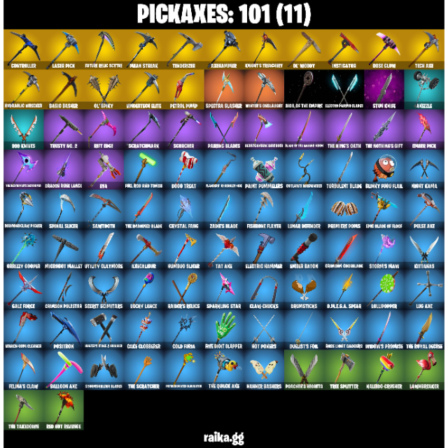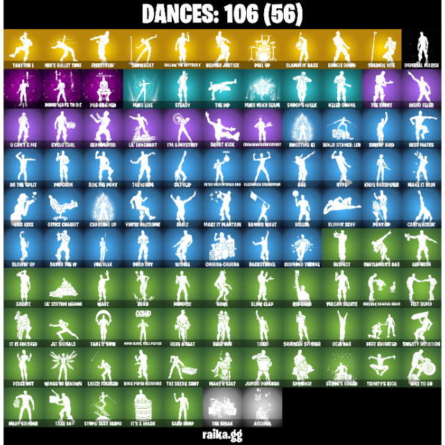 • Outfits: 87 | Back Blings: 136 | Pickaxes: 101 | Dances/Emotes: 106