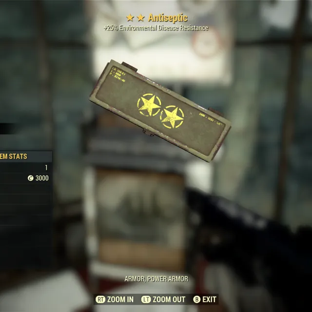 Type: Other. Five legendary antiseptic mods for armors. 25% environmental disease resistance per mod.