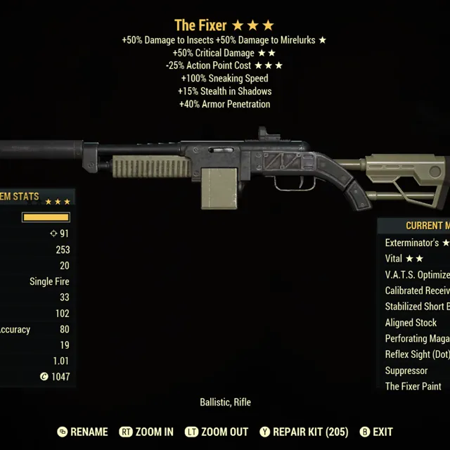 Type: Weapon. Exterminators, 50% more critical damage, 25% less vats cost lvc fixer.