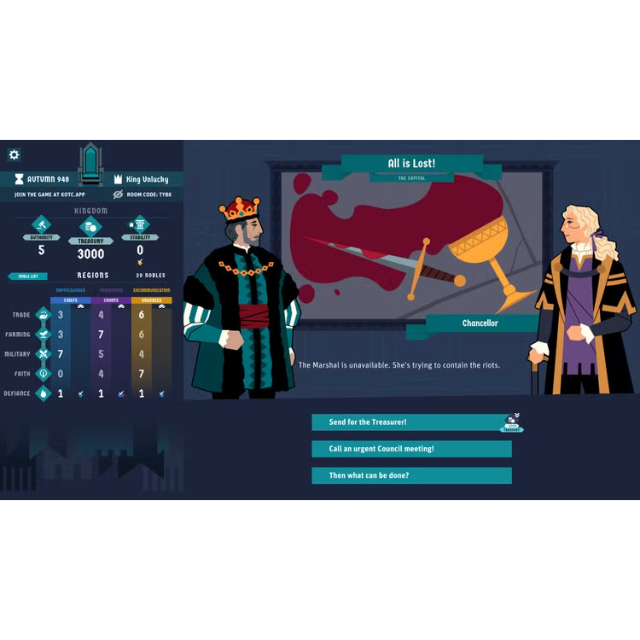 King of the Castle is a multiplayer game of shifting power dynamics and intrigue. Host games of 3 to 24 other players who join as the 'loyal' Nobles of your Council, voting on your decisions - and twisting the story to their own sinister ends.