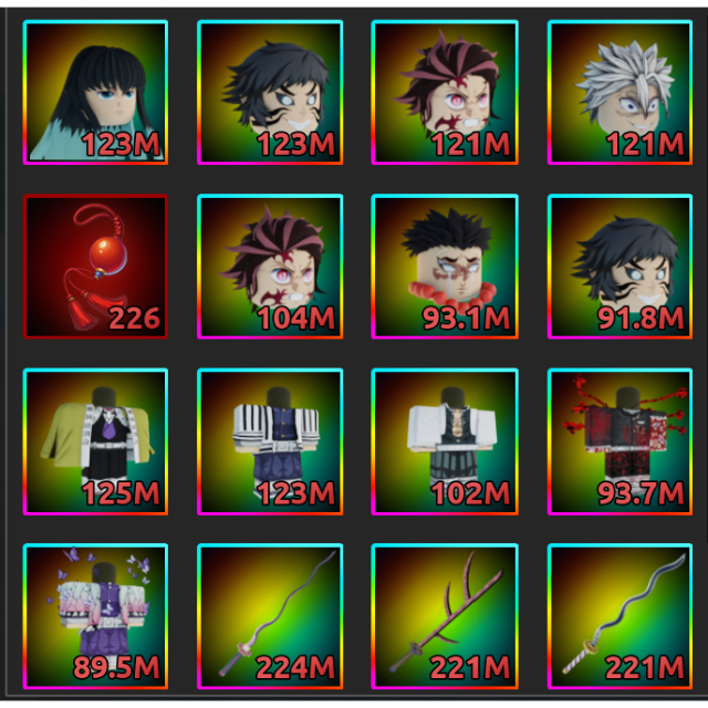 Muzan Flesh Rippers, Bloody Claws, Love Whip Katana x 3, Iguro Serpent Katana, Kokushibo Moonlit Tachi, Iguro Uniform, Tokito Mist Haze Haori, Shinazugawa Scars Attire, Grief and Sorrow Armor, Tanjiro's Demon Form Armor, Midake Helmet x 2, Minoru Immortal Helmet, Grief and Sorrow Helmet, Tanjiro's Demon Form Helmet, Premium Jade Pendant