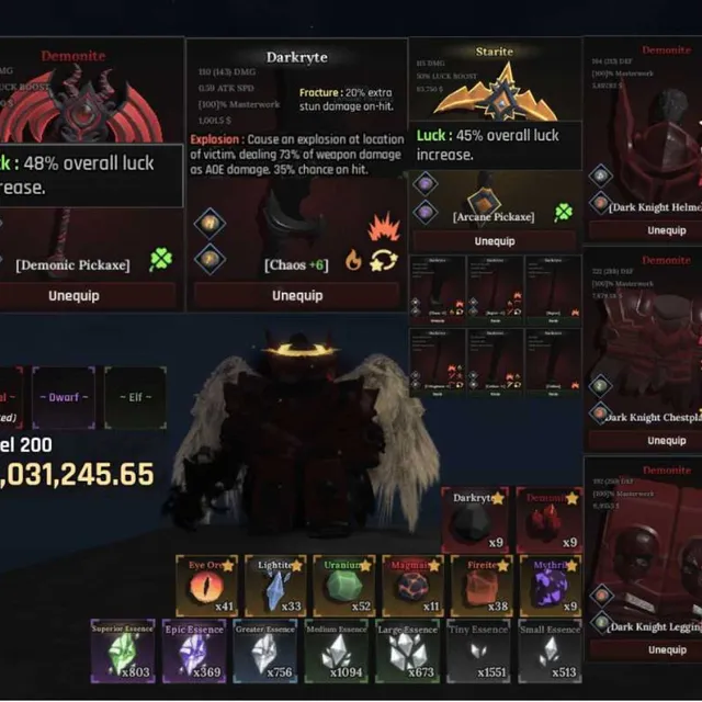 Level 200 Angel - Dwarf Race Account [MAX LUCK] with Rare Darkryte Chaos +6 [76% Explosion DMG] + Demonite Dark Knight Set +6 Enchants with Runes | Demonic Pickaxe 48% Luck and 45% Luck Arcane Pickaxe | Darkryte Cutlass, Darkryte Katana, and Darkryte Rapier | Many Ore for crafting | The Forge -
