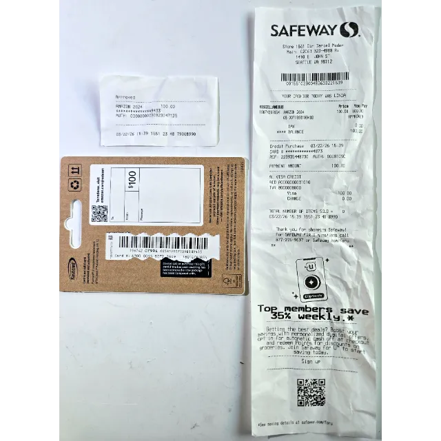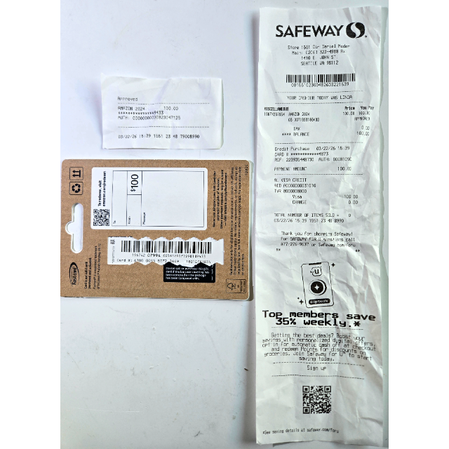 * $100 unused Amazon gift card sourced from a physical grocery store card (see receipts in photos).