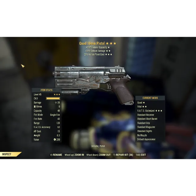 [WARNING: Stay safe! Deals made outside Gameflip aren’t protected. Always trade and chat within Gameflip.] [WARNING: Stay safe! Deals made outside Gameflip aren’t protected. Always trade and chat within Gameflip.] [WARNING: Stay safe! Deals made outside Gameflip aren’t protected. Always trade and chat within Gameflip.] Weapon | 10MM Pistol Q5025, Quad 10MM Pistol(50% Critical Shot Damage,25% Less Vats AP Cost)